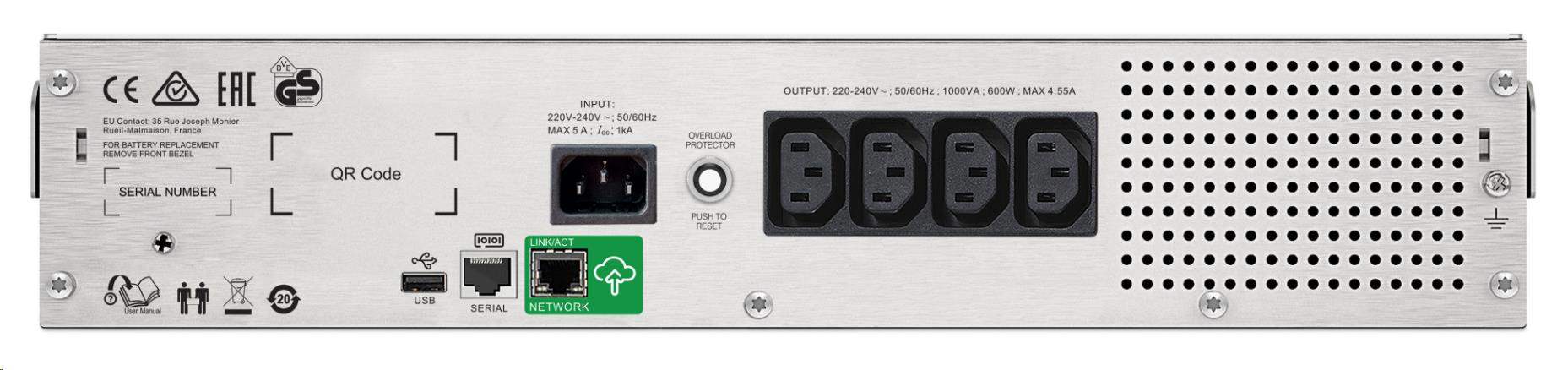 Number of sockets:4; Purpose of use:Desktop, Active Network Elements; Solution:Rackmount; VA:1000; Height in rack:2U; Topology:Line-Interactive; Phase (Input/Output):0.0423611111111111; Communication:USB, DB-9 - RS-232, LAN connectivity