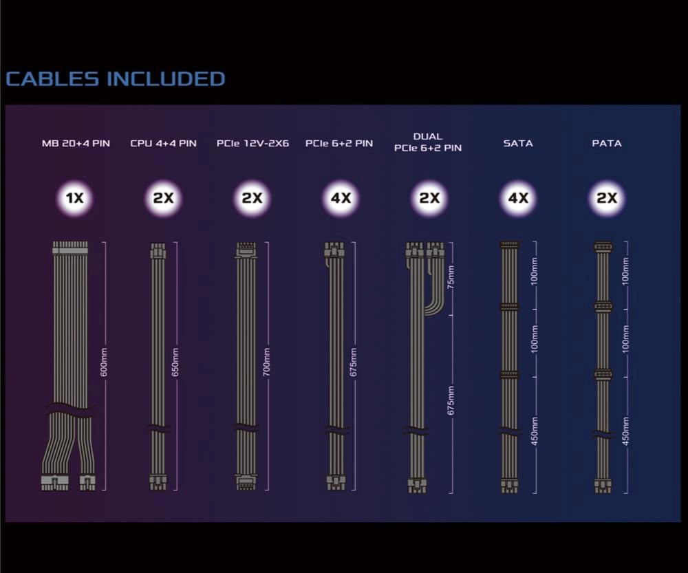 PSU format:ATX; Connectors:8pin CPU 1x, PCIe 8-pin, SATA 15-pin, Molex; Motherboard connectors:ATX 24-pin; PSU properties:Modular cabling