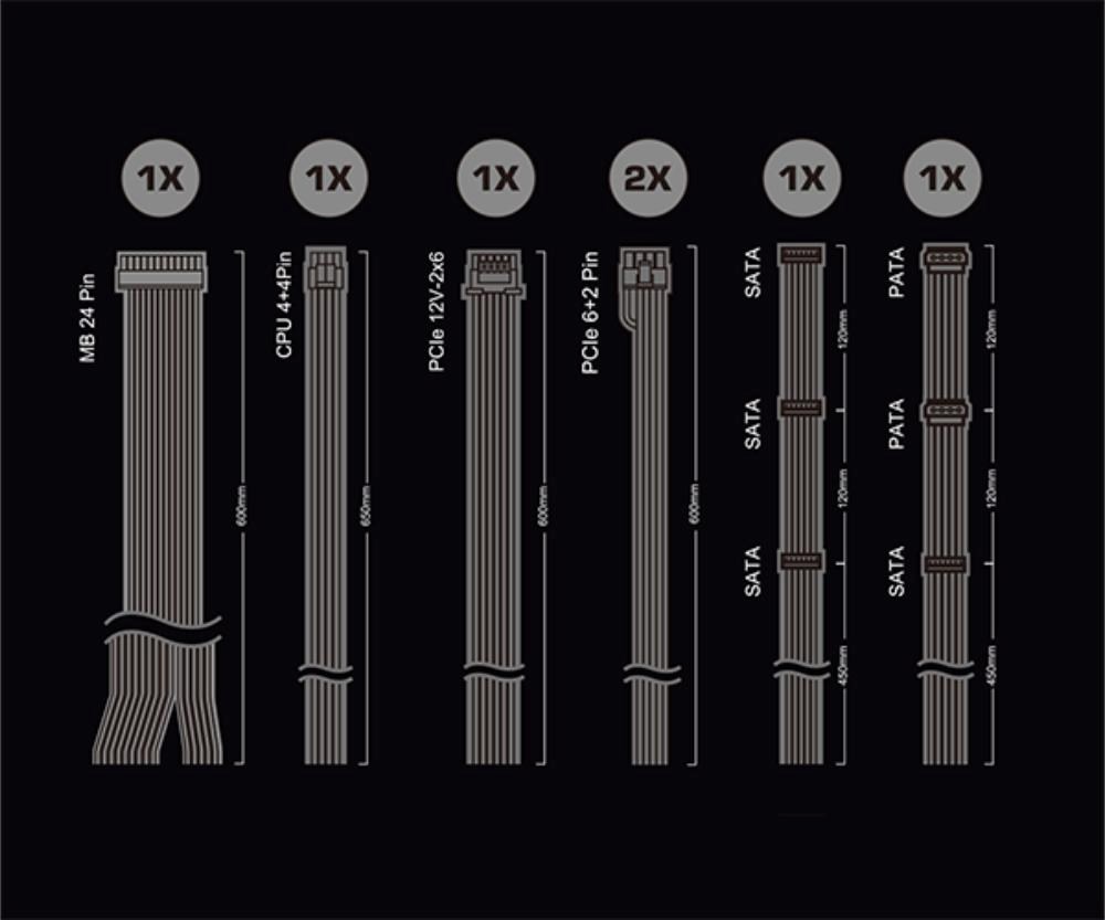 PSU format:ATX; Connectors:8pin CPU 1x, PCIe 8-pin, SATA 15-pin, Molex; Motherboard connectors:ATX 24-pin