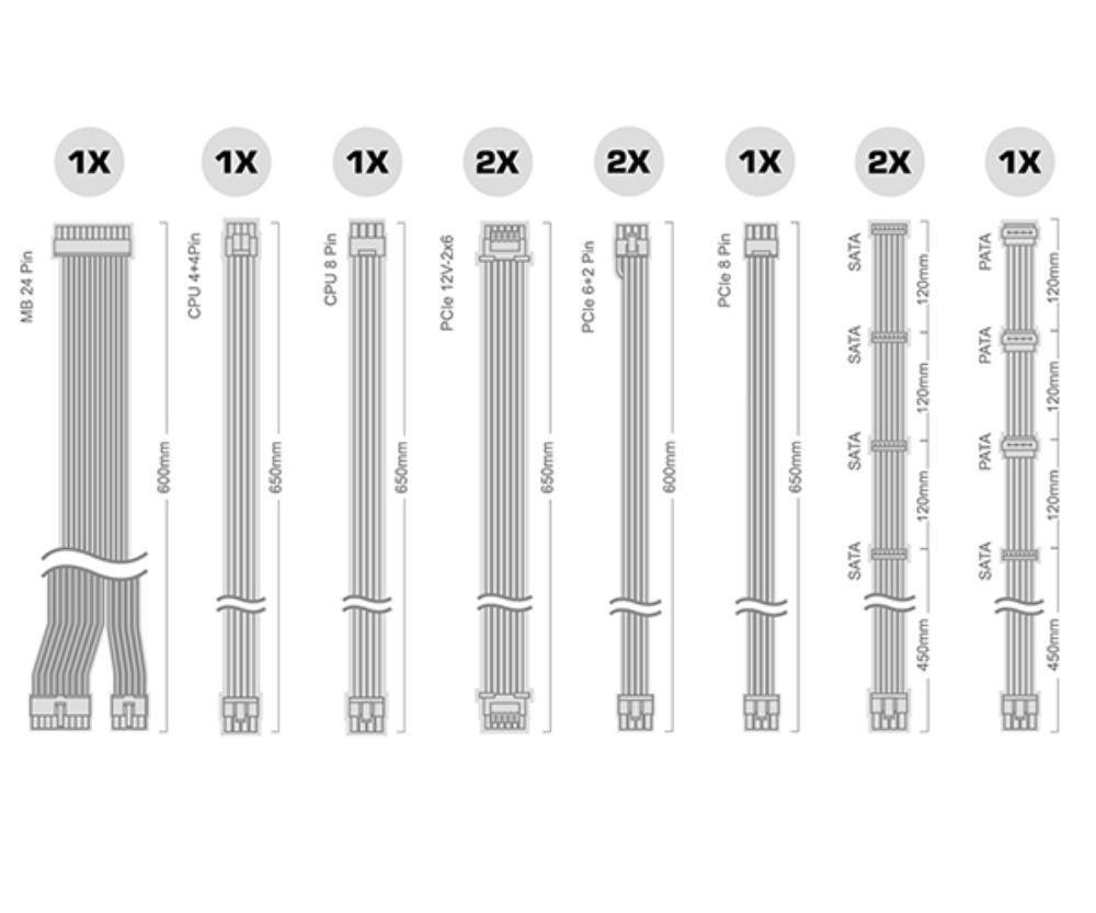 PSU format:ATX; Connectors:8pin CPU 1x, PCIe 8-pin, SATA 15-pin, Molex; Motherboard connectors:ATX 24-pin; PSU properties:Modular cabling