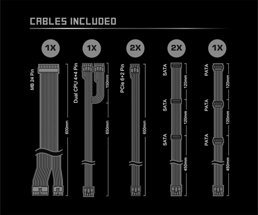 PSU format:ATX; Connectors:8pin CPU 1x, PCIe 8-pin, SATA 15-pin, Molex; Motherboard connectors:ATX 24-pin; PSU properties:Modular cabling