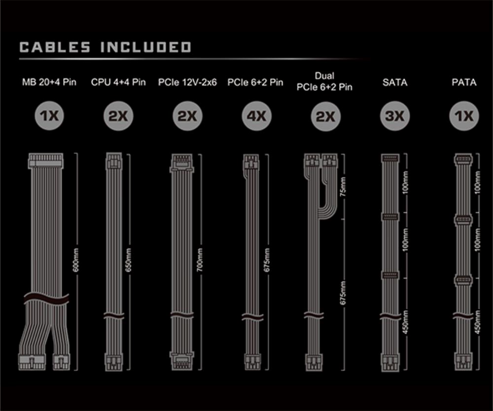 PSU format:ATX; Connectors:8pin CPU 1x, PCIe 8-pin, SATA 15-pin, Molex; Motherboard connectors:ATX 24-pin; PSU properties:Modular cabling