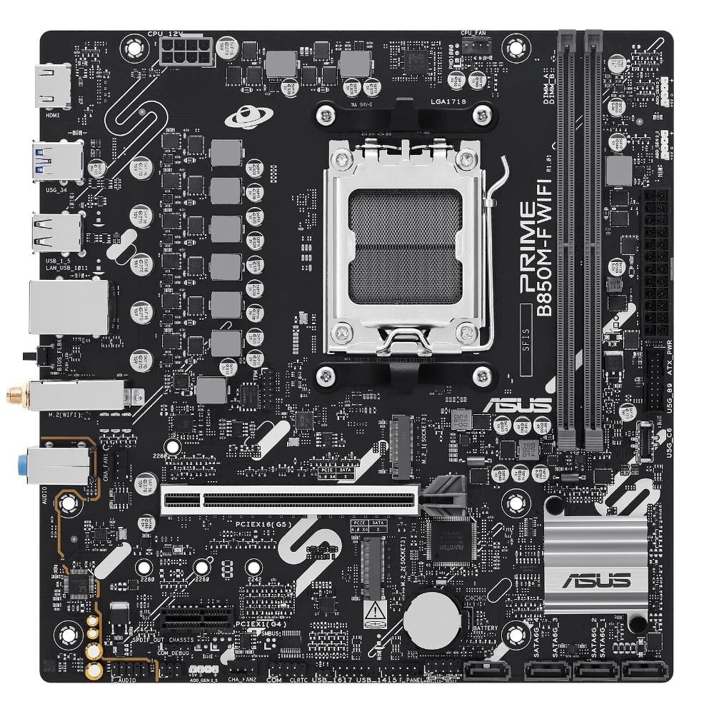 Format:micro ATX; Chipset:AMD B850; Socket:Socket AM5 (LGA 1718); Motherboard memory module type:DDR5; RAID support:0, 1, 5, 10; PCI express 16x:1; COM port