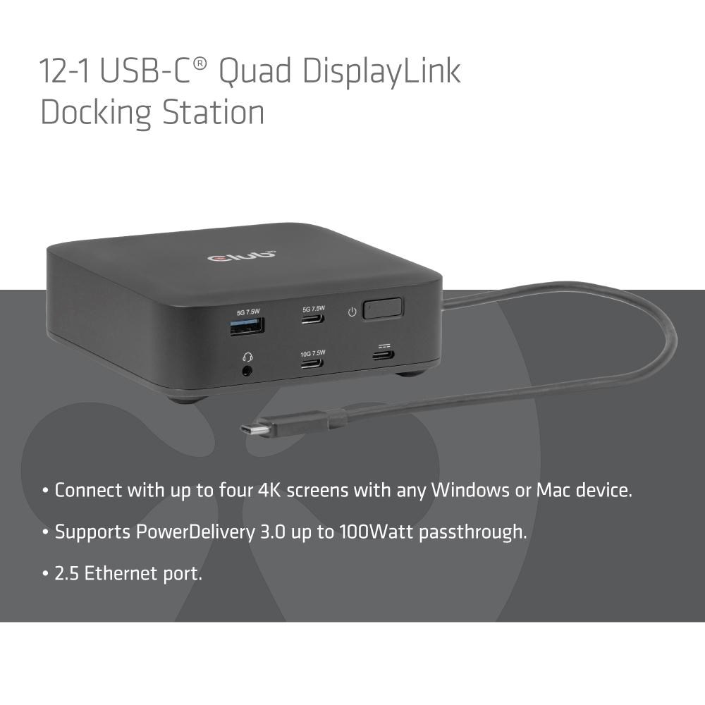 Club3D Dokovací stanice USB-C 12v1, 2xHDMI, 2xDP, 2xUSB-C, 1xUSB-C PD, 3xUSB, 1xRJ45, 1x3.5mm, černá
