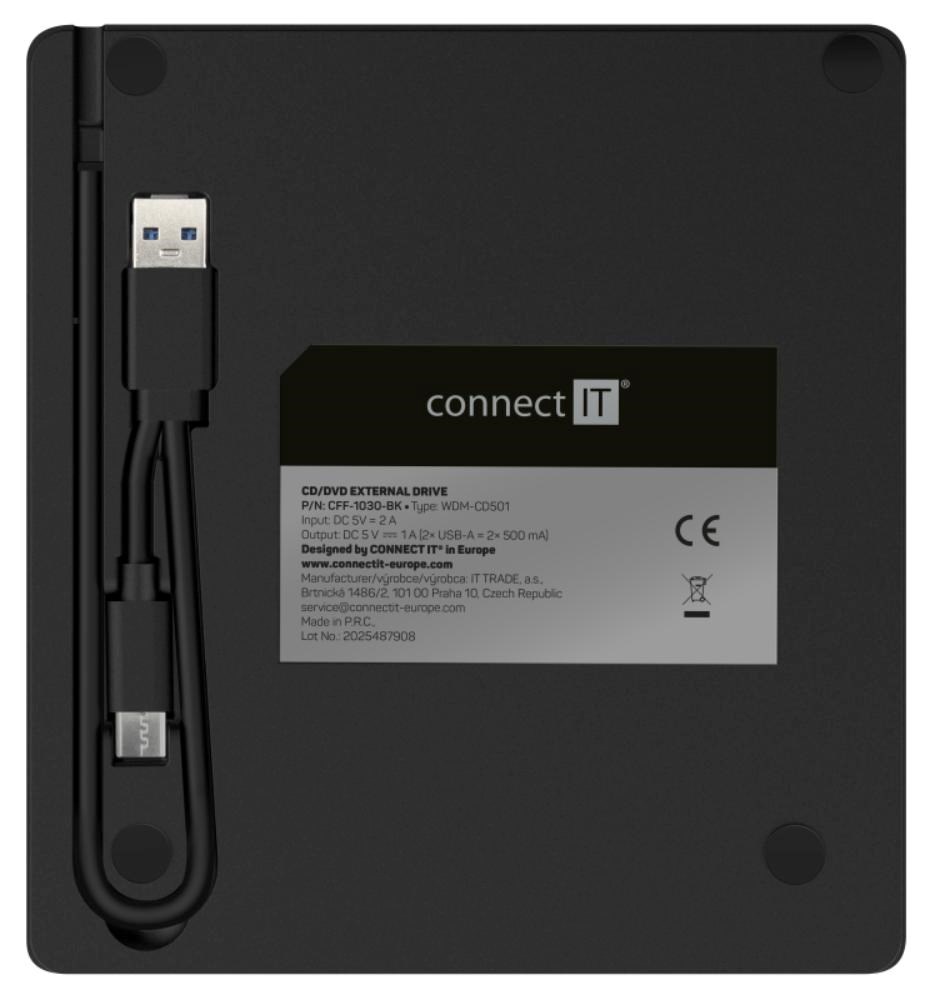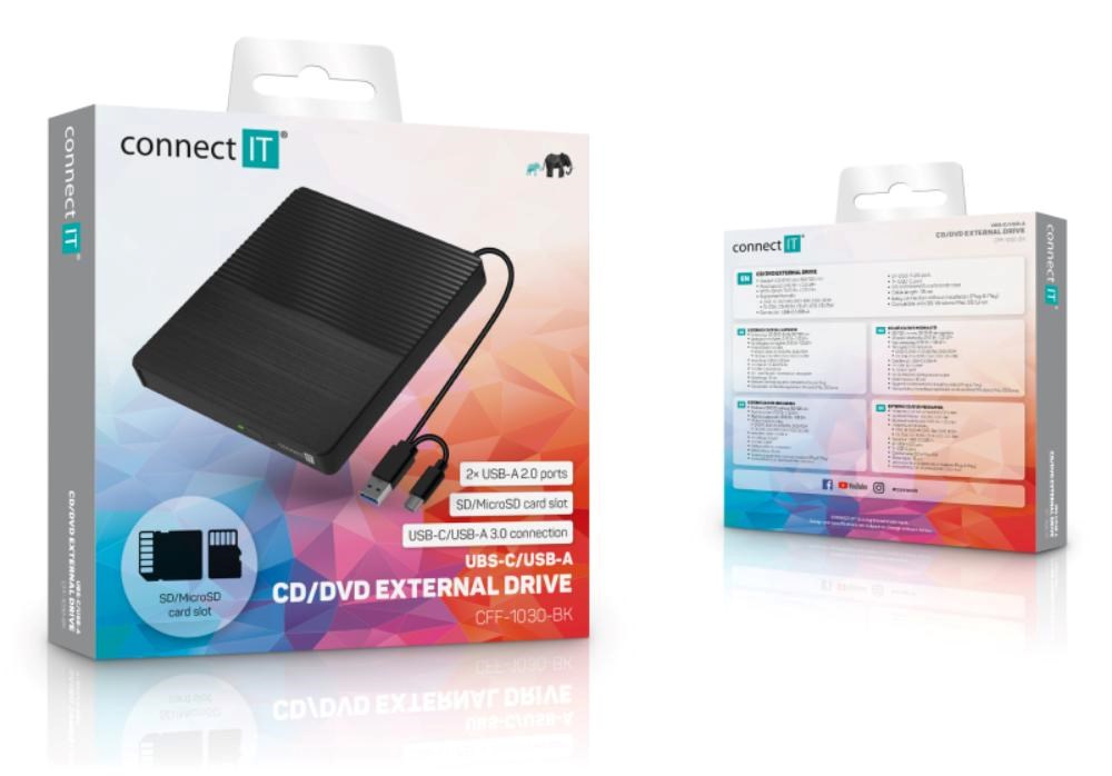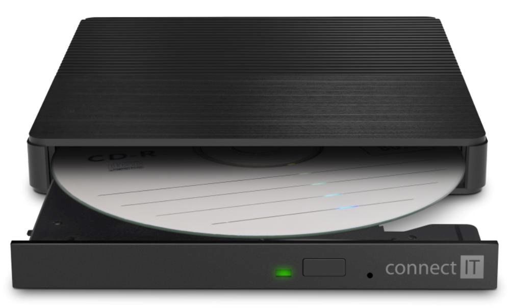 CONNECT IT Externí mechanika CD/DVD 3v1 SlimDrive, čtečka MicroSD/SD, 2xUSB, USB-A/USB-C, černá
