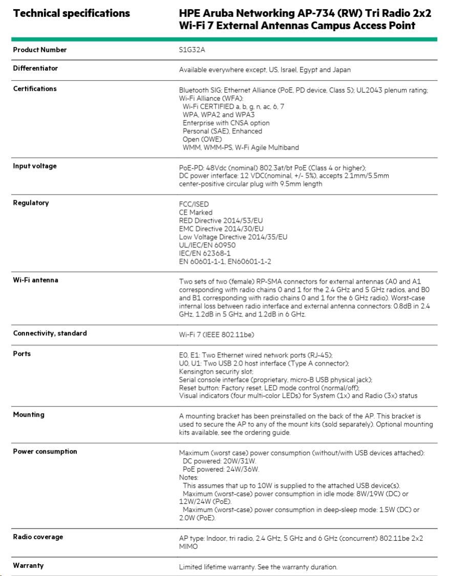 HPE Aruba Networking AP-734 (RW) Tri Radio 2x2 Wi-Fi 7 External Antennas Campus Access Point S1G32AR RENEW