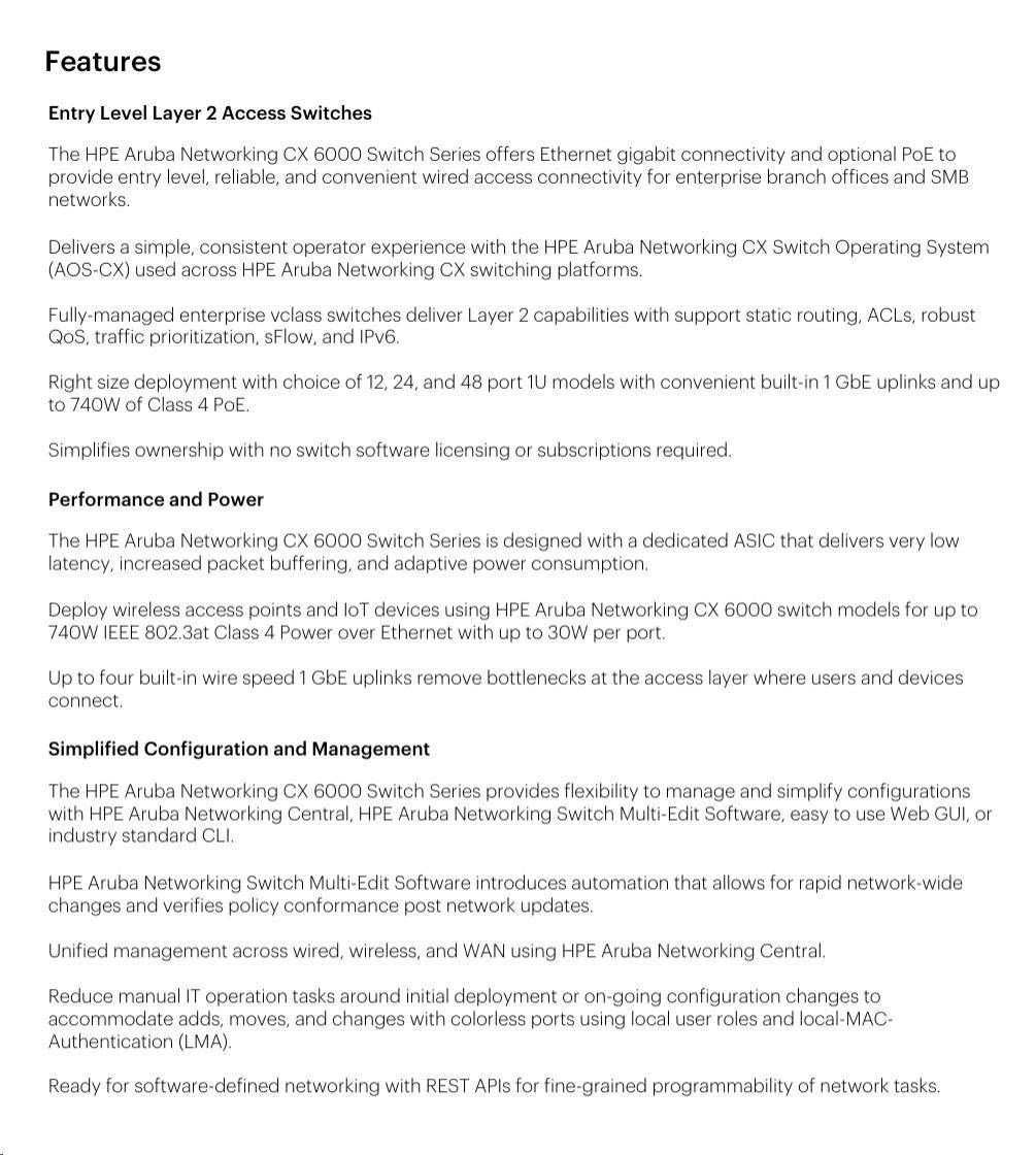 The HPE Aruba Networking CX 6000 Switch Series is a modern family of entry-level access switches ideal for branch offices, midsize businesses, and small enterprises. Optimized for reliable, simple, and secure access, the CX 6000 Switch series provides a convenient and cost-effective wired access solution for networks supporting IoT, mobile, and cloud applications.