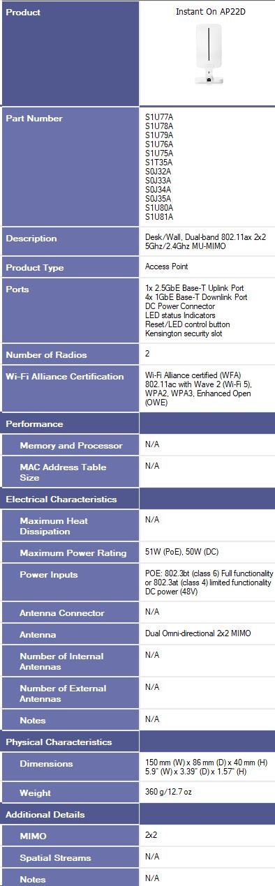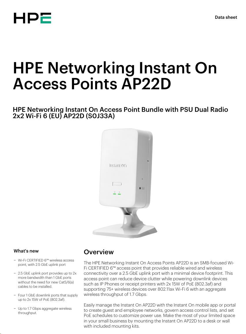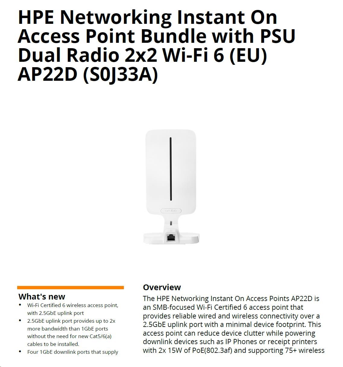HPE Networking Instant On Access Point AP22D Bundle with PSU Dual Radio 2x2 Wi-Fi 6 (EU) AP22D
