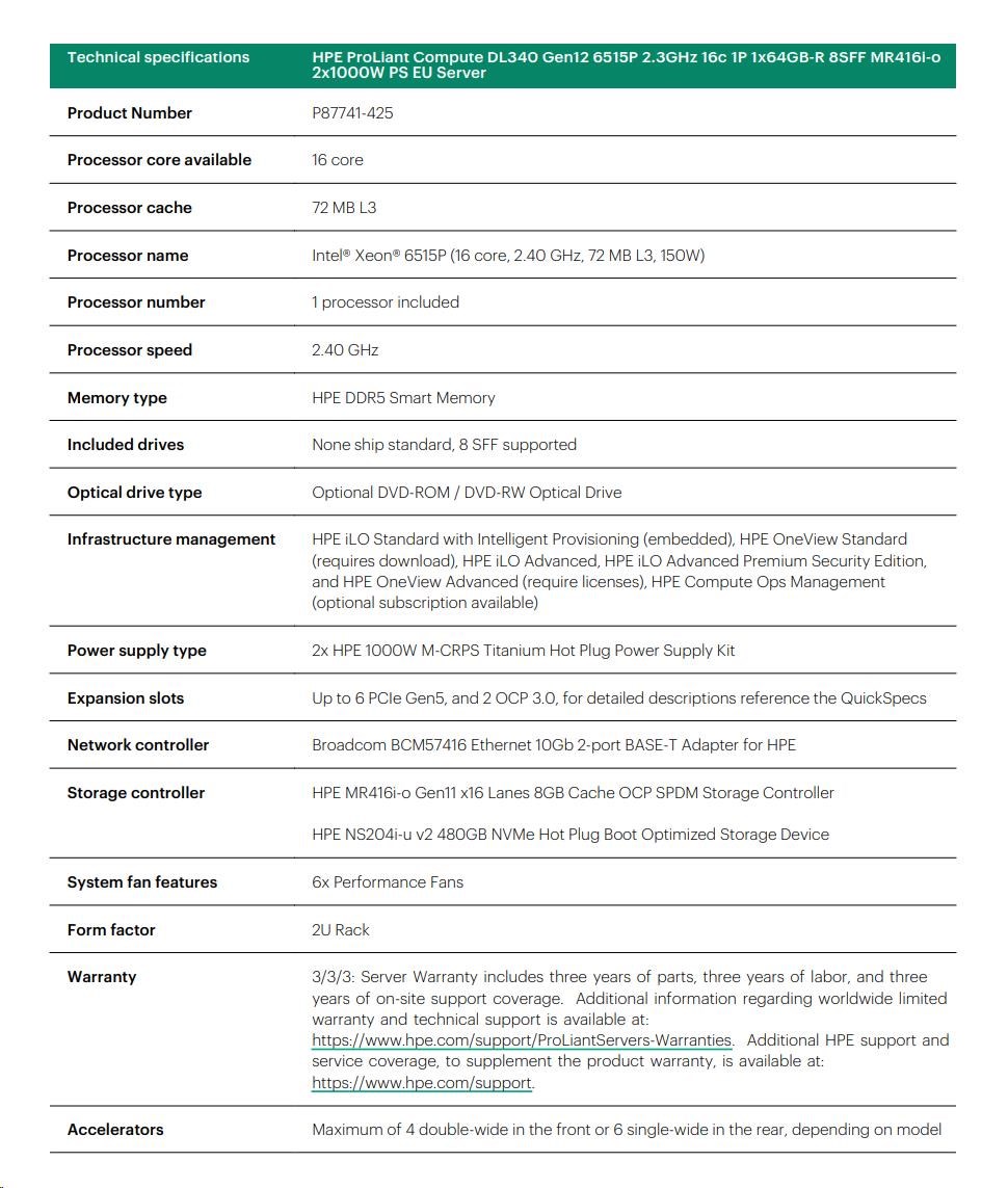 HPE PL DL340 Gen12 6515P (2.4/16C) 1x64G (P69728) NS204(2x480) MR416i-o 8SFF 2x1000W 10GbE NBD333 Smart Choice