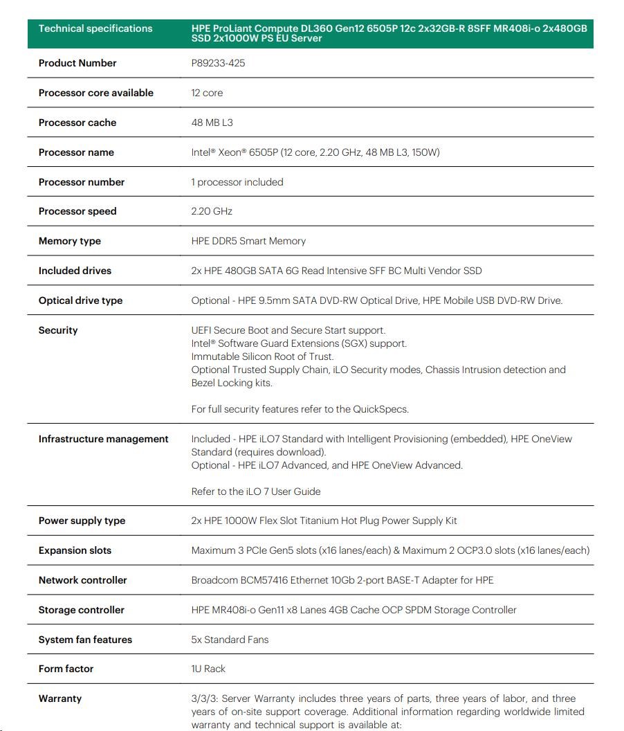 HPE PL DL360g12 6507P (3.5G/8C) 2x32G (P69727) 2x480G MR408i-o 8SFF 2x1000W 10GbE NBD333 Smart Choice