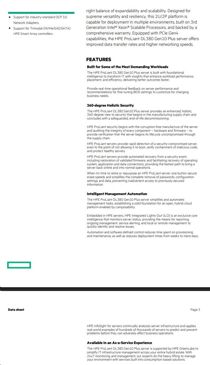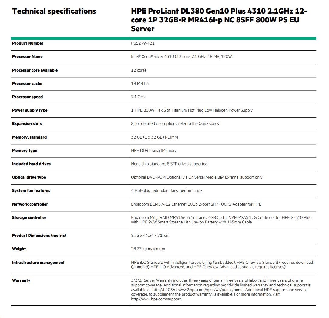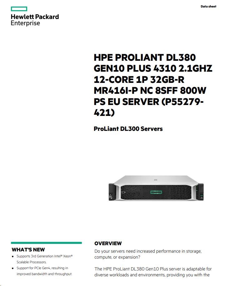 HPE PL DL380g10 Plus 4310 (2.1/12C) 32G MR416i-p/4Gssb 8SFFBCU3 1x800Wtit L9 ocp2x10GSFP+ RF NBD333 P55279-421 RENEW