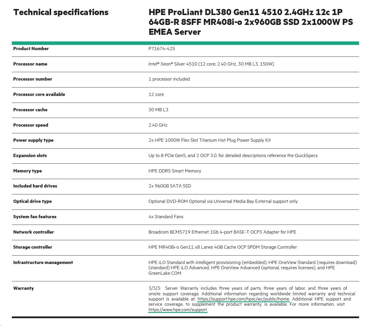 Model Name HPE PL DL380g11 4510 (2.4/12C) 2x32G 2x960G 8SFF MR408i-o 2x1000W 4x1Gb NBD333