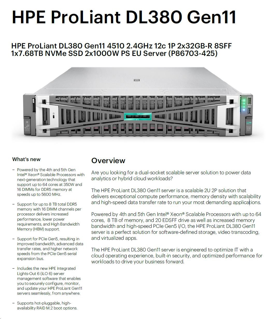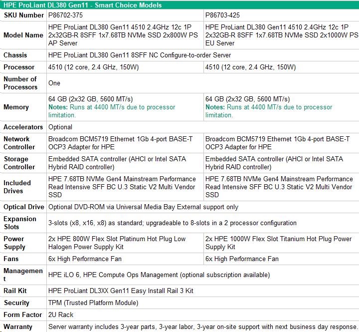 HPE PL DL380g11 4510 (2.4G/12C) 2x32G (p64706) 1x7.68TB NVMe 2x1000W 8SFF 4p1G Smart Choice