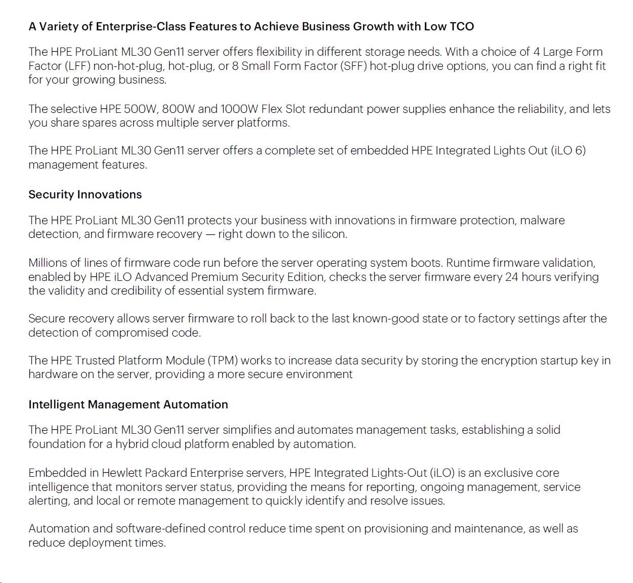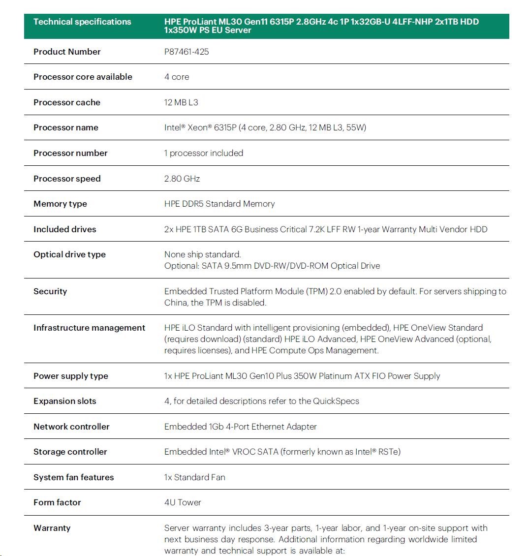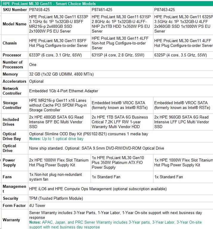 HPE PL ML30g11 6315P (2.8G/4C4T) 1x32G 2x1TB SATA 4LFF-NHP 1x350 VROC 4p1G NBD311 Smart Choice