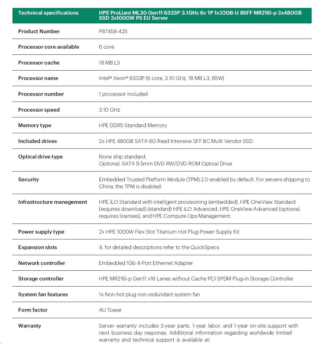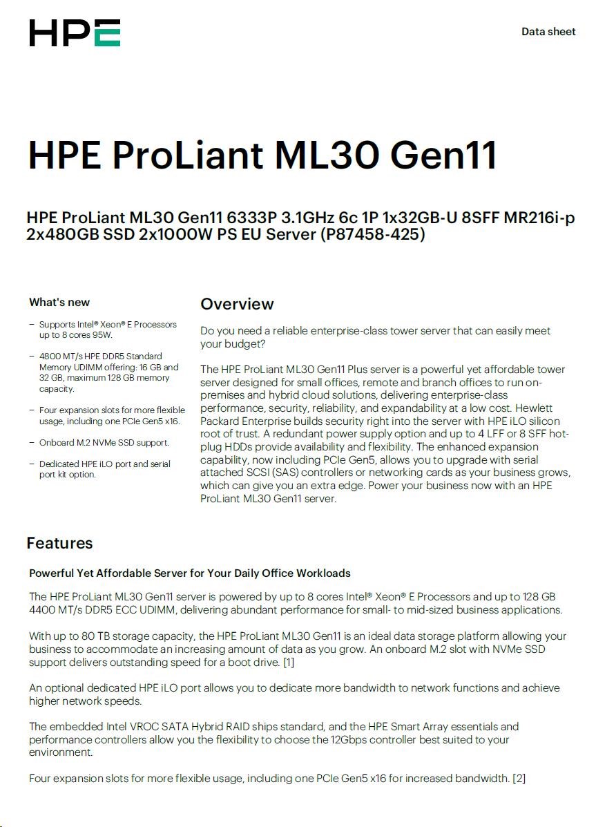 HPE PL ML30g11 6333P (3.1G/6C12T) 1x32G 2x480G 2x1000W MR216i-p 8SFF 4p1G NBD311 Smart Choice