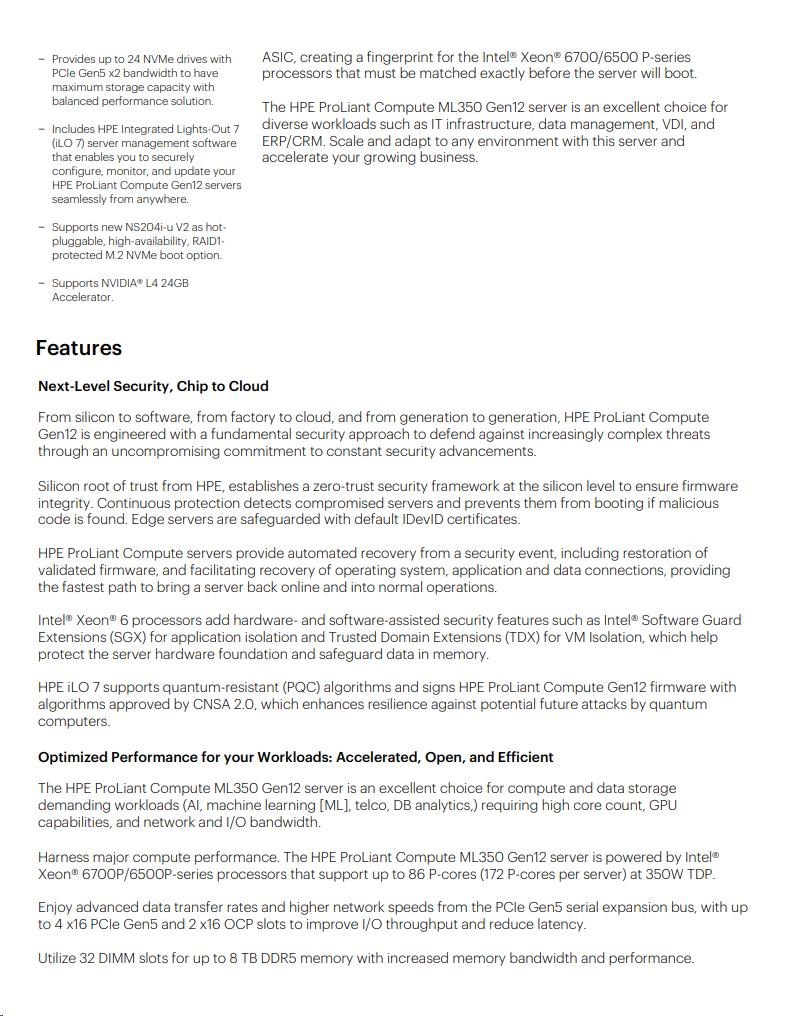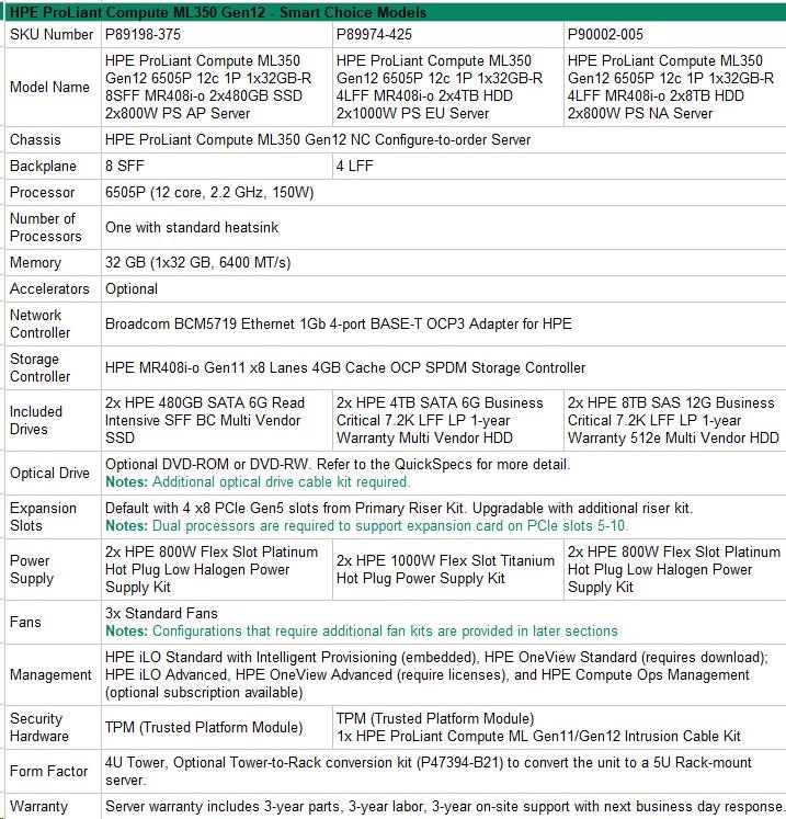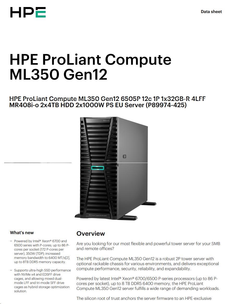 HPE PL ML350g12 6505P (2.2/12C) 1x32G (P69728) 2x4TB 4LFF MR408i-o2x1000W 1GbE NBD333 Smart Choice
