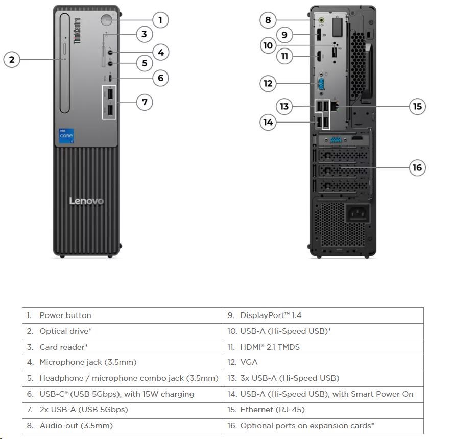 PC:SFF (Small Form Factor); Operating system:Windows 11 Pro; Processor type:Intel Core i5; GPU chip:Intel UHD; Disc Type:SSD; Interface:LAN (RJ-45), HDMI, VGA, USB 2.0, USB 3.2, 3.5mm Jack, DisplayPort, USB Type-C; PC equipment:Integrated GPU, Card reader, Keyboard + Mouse, Wi-Fi, BlueTooth, Integrovaný reproduktor