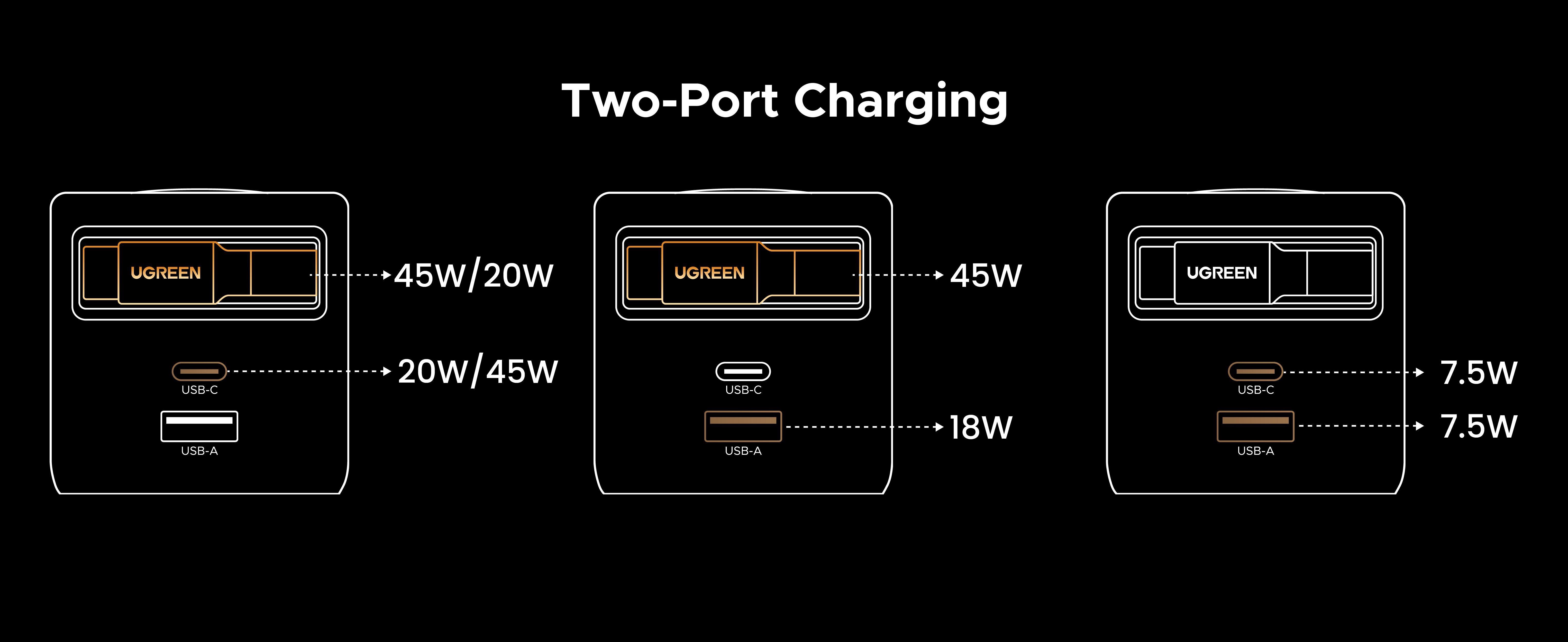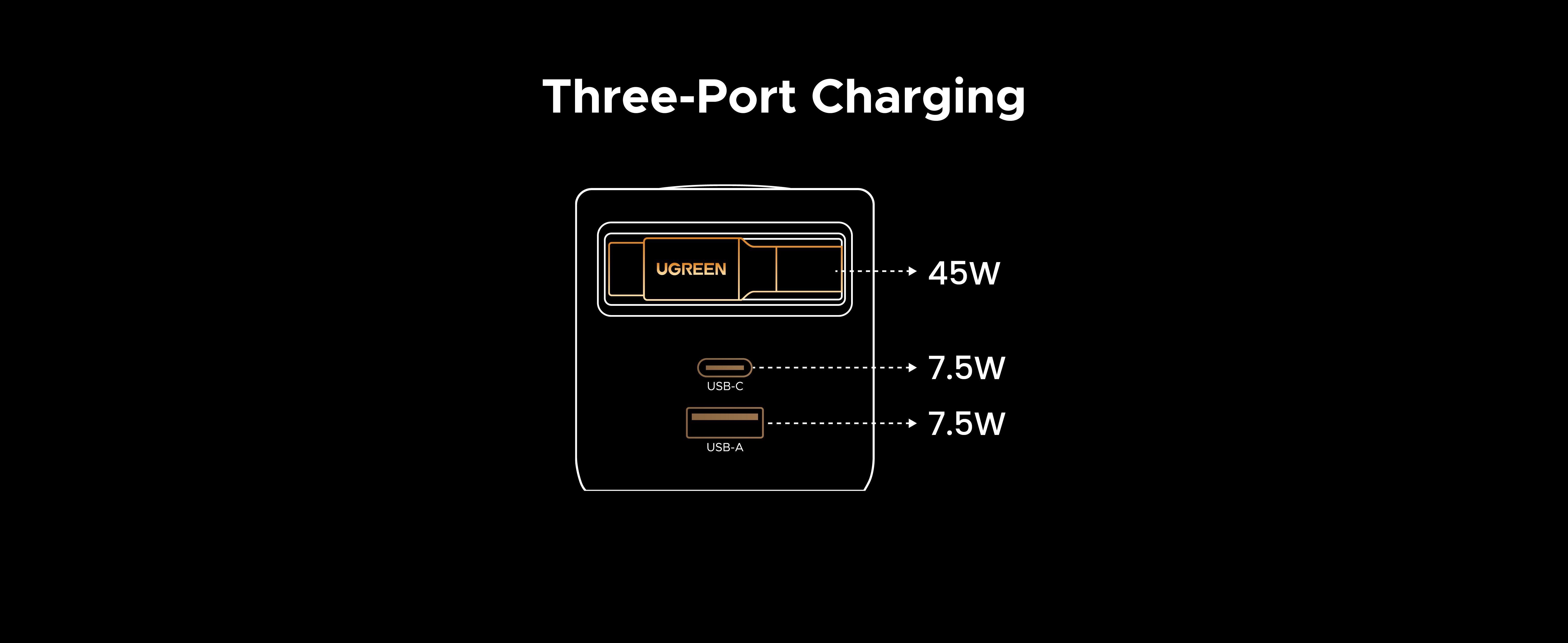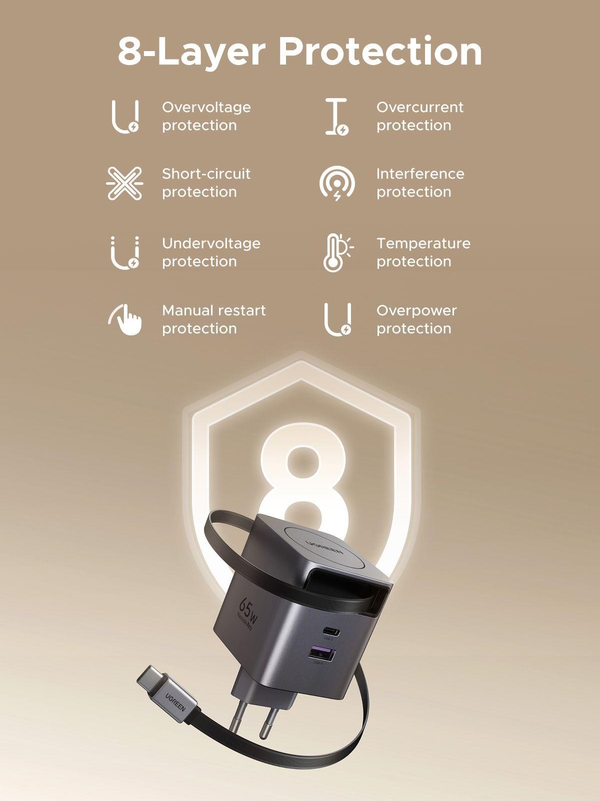 UGREEN síťová rychlonabíječka se zatahovacím kabelem 65W 3-Port, 2x USB-C, 1x USB-A, GaN, stříbrná