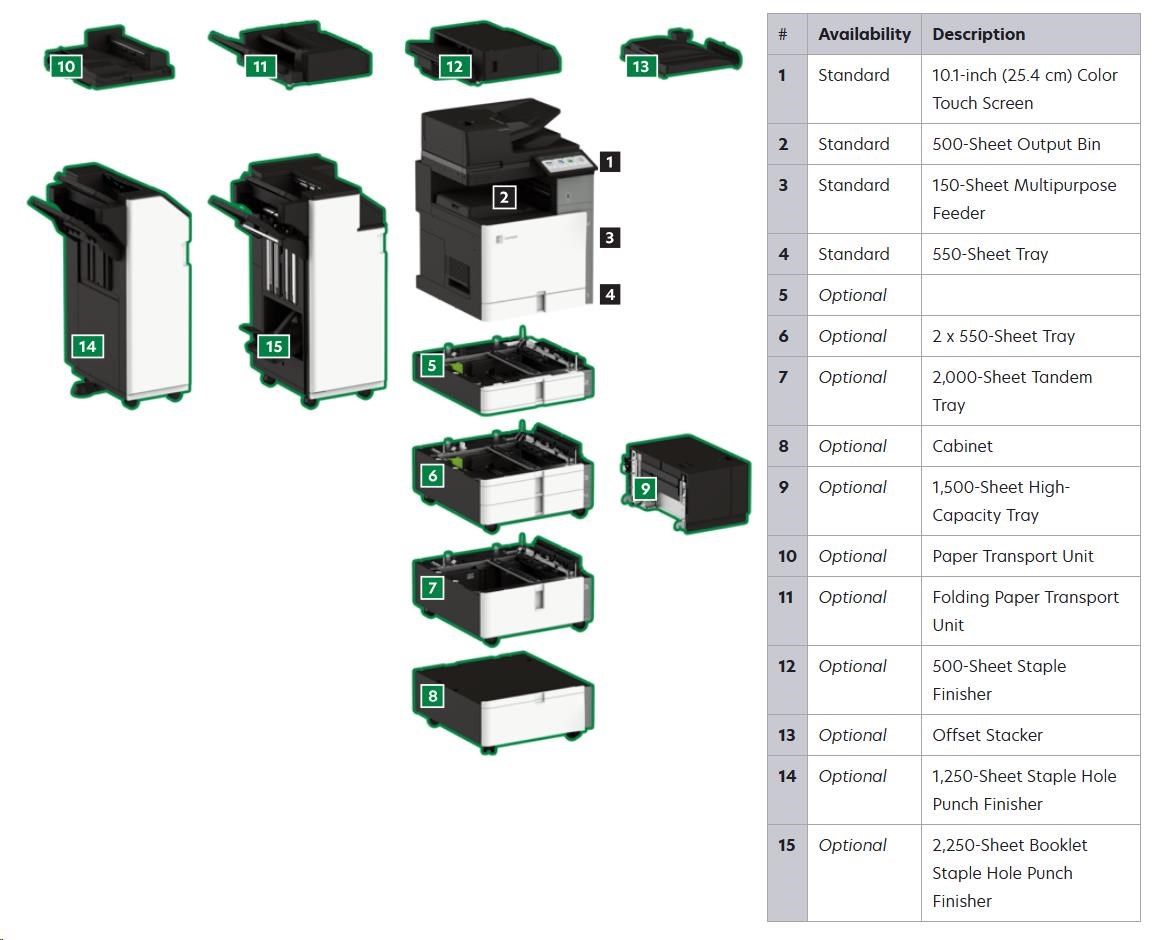 Printing:Laser; Maximum print/media size:A3; Print resolution (in DPI):1200x1200; Printer interface:network; Maximum print speed (A4 per min):45; Automatic double-sided printing (Duplex); Standard paper tray number:2; Maximum paper tray number:6; Scanner type:flat; Scanner resolution (in DPI):600; Automatic document feeder; Fax:optional